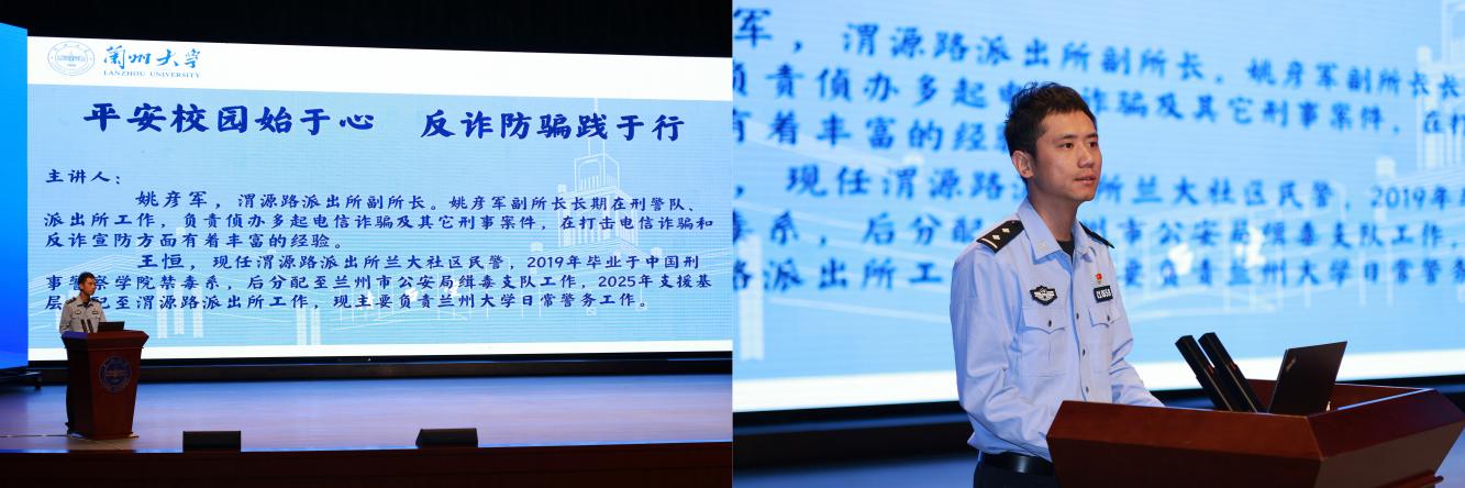 渭源路派出所民警王恒开展了《平安校园始于心,反诈防骗践于行》专题讲座。王警官结合多年刑侦经验,剖析了当前高发的电信网络诈骗类型及手法,提醒同学们警惕刷单、冒充客服、网络交友等诈骗形式,并从校园实际出发,介绍了近期发生在高校的典型案例,用生动有趣的例子提醒同学,呼吁同学们增强自我保护意识,做到“不轻信、不转账、不泄露”。