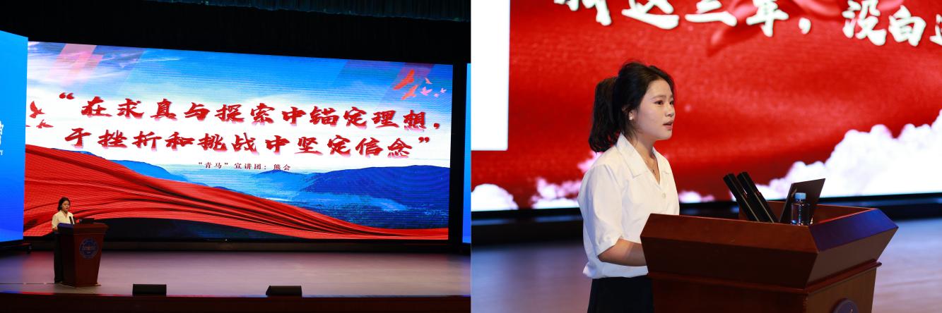 “青马”宣讲团成员熊会以《在求真与探索中锚定理想,于挫折和挑战中坚定信念》为题,分享了她在学术研究与个人成长中的心得体会。她结合自身经历,鼓励新生在科研道路上保持好奇心与批判思维,勇于面对失败,在探索中明确人生方向。她强调,青年学生应把个人理想融入国家发展大局,在新时代中担当作为。